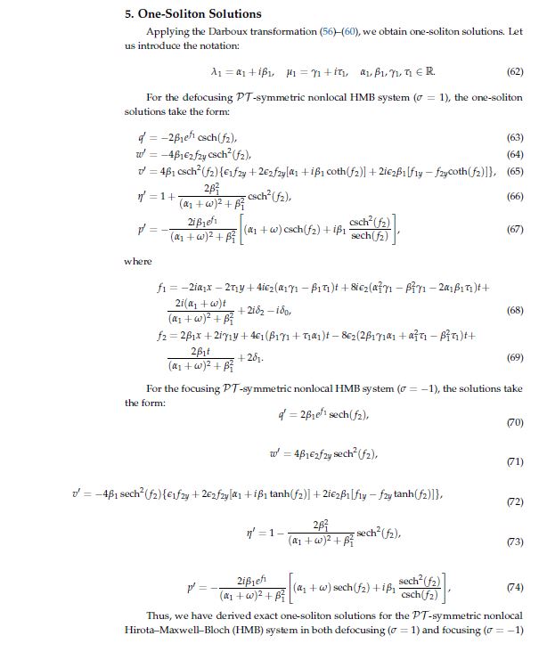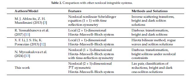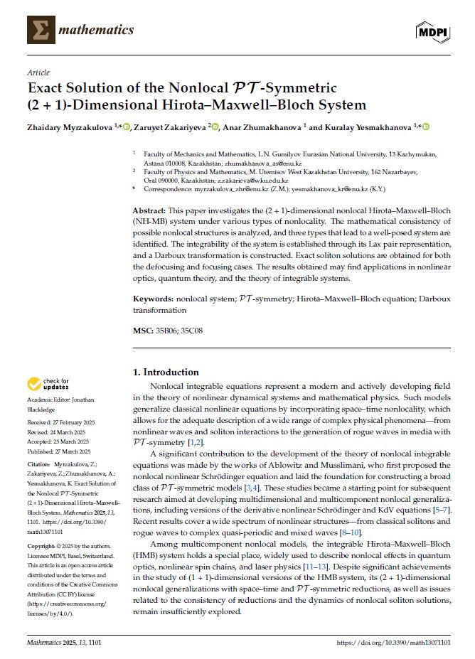 Мақалаға сілтеме: Myrzakulova, Z., Zakariyeva, Z., Zhumakhanova, A., & Yesmakhanova, K. (2025). Exact Solution of the Nonlocal PT-Symmetric (2+ 1)-Dimensional Hirota–Maxwell–Bloch System. Mathematics, 13(7), 1101. https://www.mdpi.com/2227-7390/13/7/1101